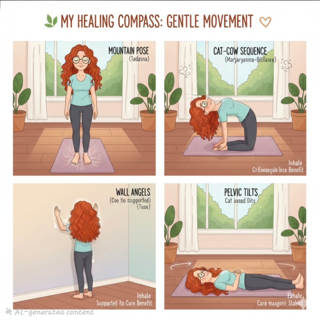 - Before Movement Check-In: Before attempting any of the movements (Mountain Pose, Cat-Cow, Wall Angels, or Pelvic Tilts), take a minute to identify where you are holding tension.