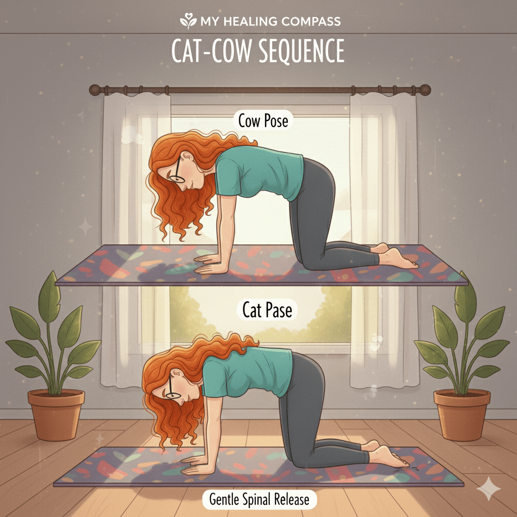 Movement 2: Cat-Cow Sequence (Marjaryasana-Bitilasana) – Gentle Spinal Release.